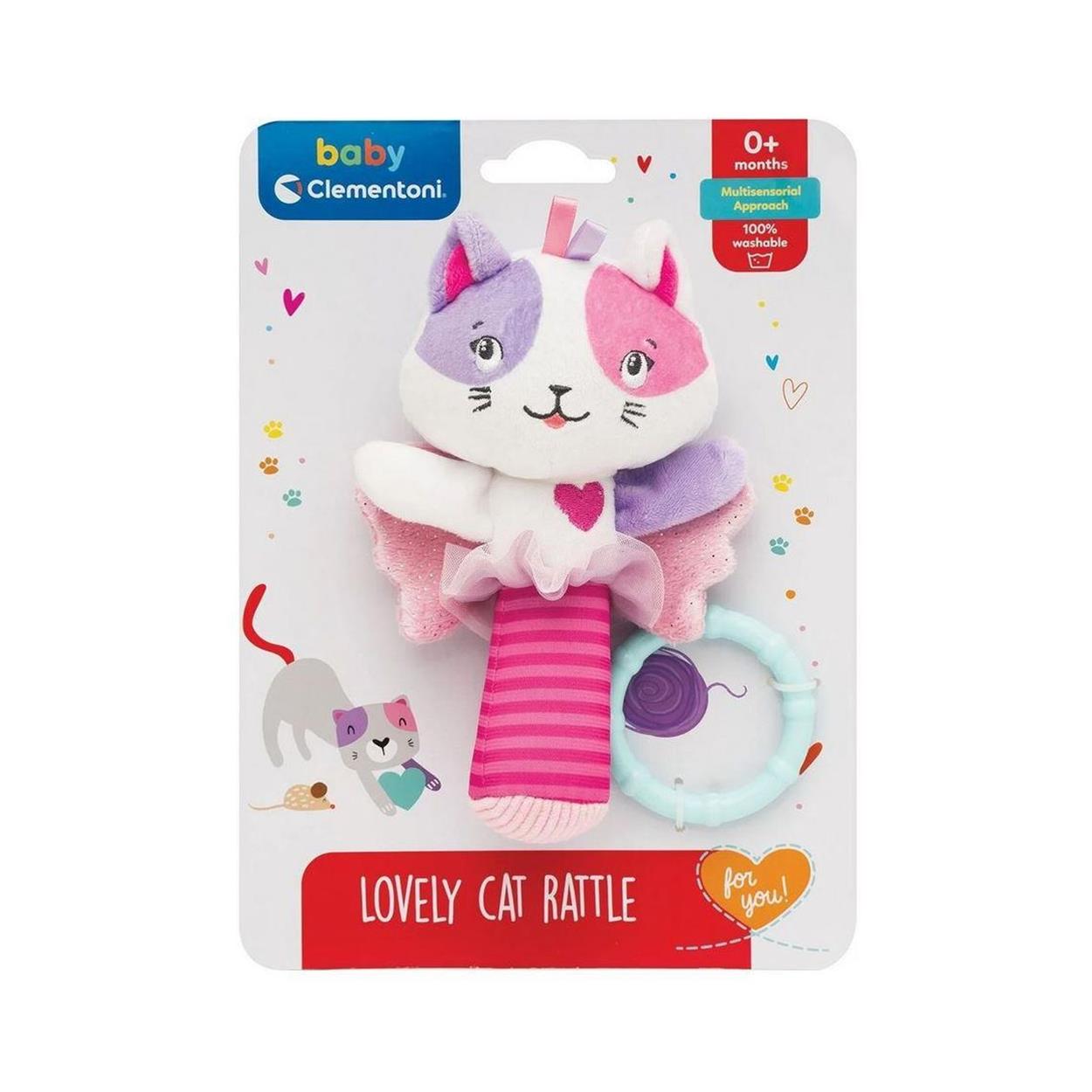 Soft kitten rattle, easy to hold and handle. Helps sensorial development with its crinkle material, rattle and different types of fabric. Comes with handy ring for hanging up anywhere.