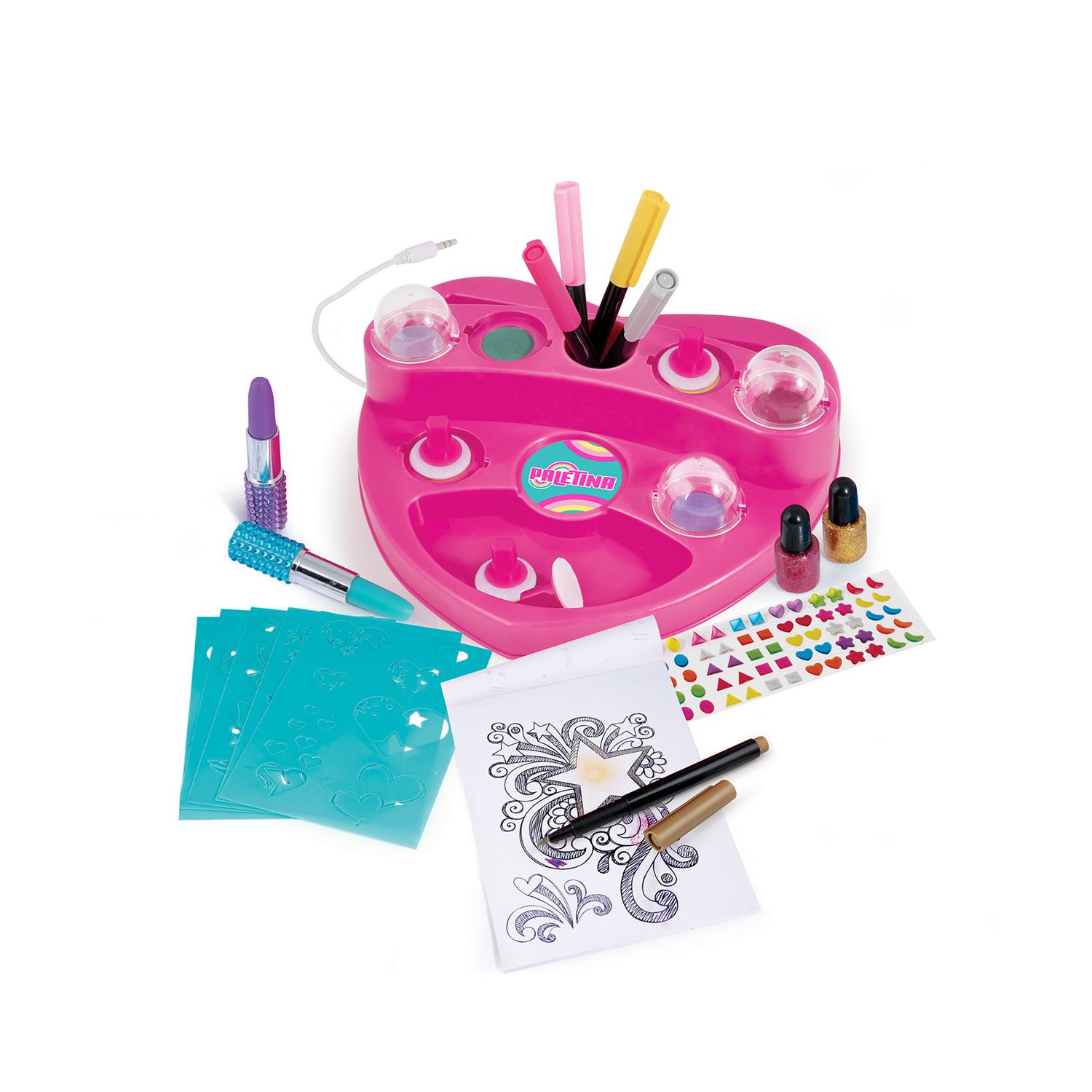 Hars-Shape Drawing Palette, 6 Powder Paints, 6 Brushes-Sponges, 6 Stencil Sheets, 5 Markers, 1 Lipstick Markers, 2 Bottles Glitter Glue, Drawing Pad, 3D Decorative Stickers